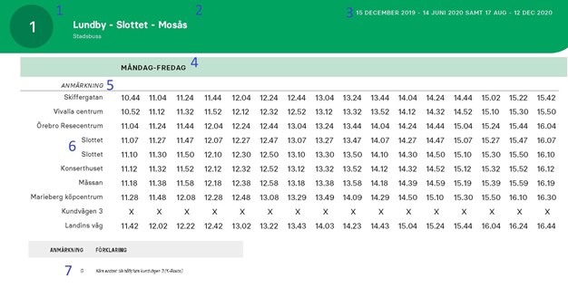 6. En lista på hållplatser med fasta avgångstider. Du läser tidtabellen från vänster till höger, vilket innebär att i exemplet från hållplats Skiffergatan går bussen klockan 10.44, 11.04, 11.24, 11.44 och så vidare.